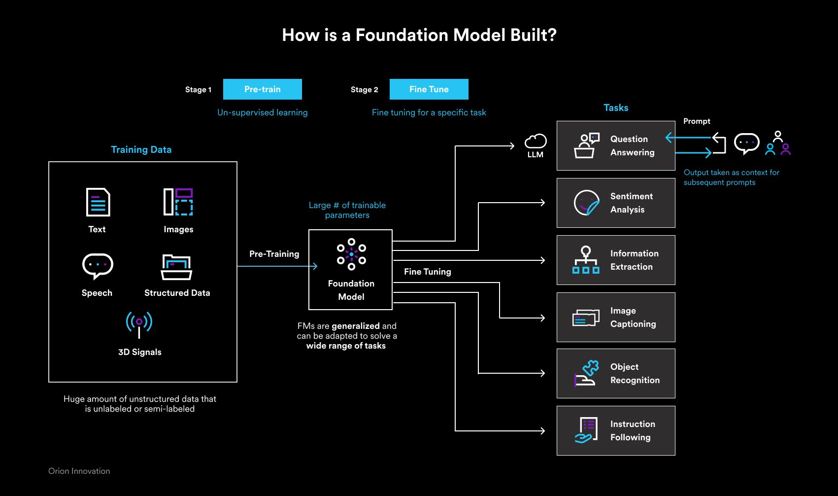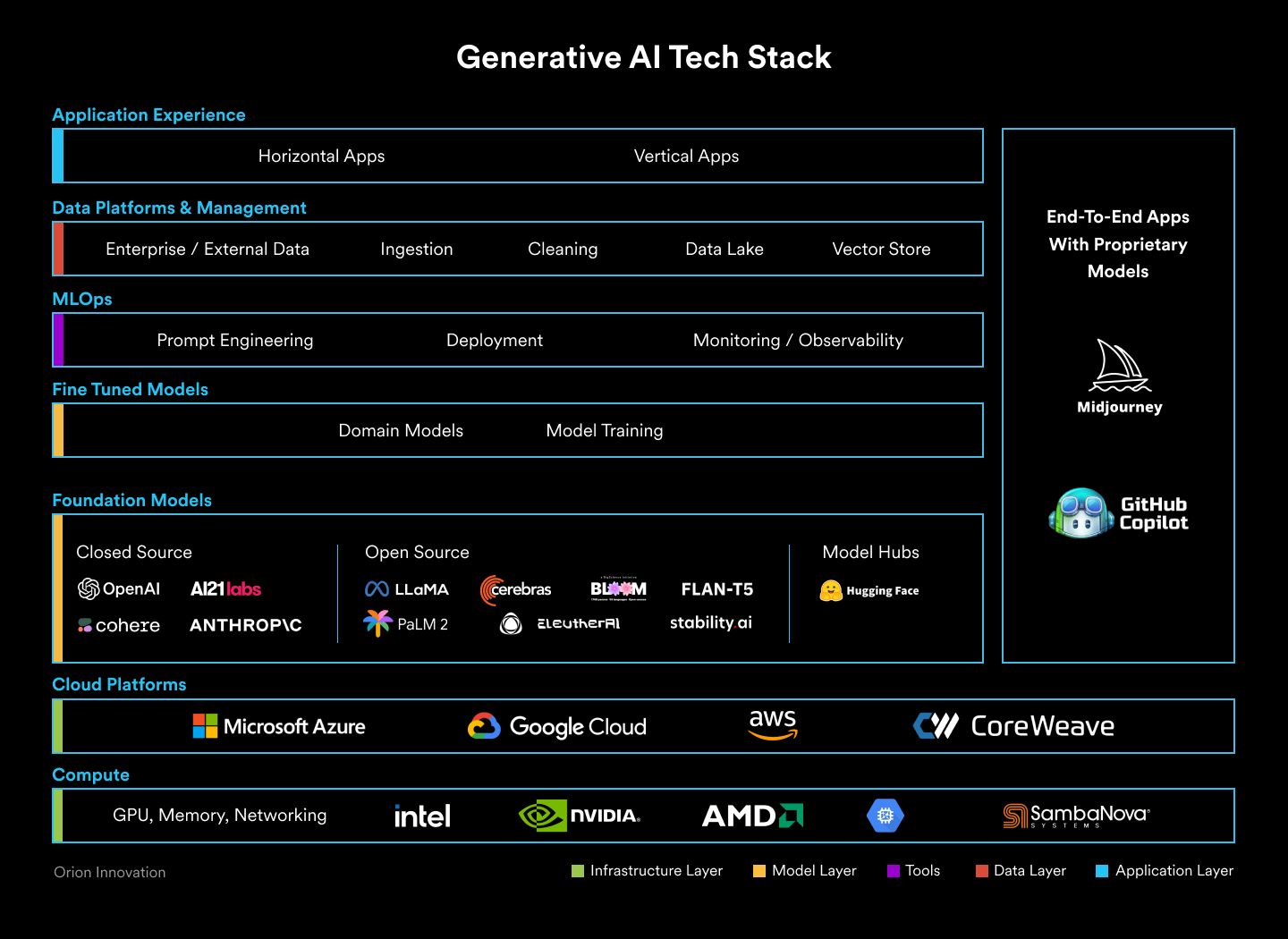 Home / Perspectives / Understanding Generative AI: A Tech Stack Breakdown Want to learn more? CONTACT US Contact Us First Name*Last Name*Company*Work Email* What can we help you with?*How did you hear about us?I agree to receive marketing communications from Orion Innovation.* I agree to receive marketing communications from Orion Innovation. We are committed to protecting and respecting your privacy. Please review our privacy policy for more information. If you consent to us contacting you for this purpose, please tick above. By clicking Register below, you consent to allow Orion Innovation to store and process the personal information submitted above to provide you the content requested.PhoneThis field is for validation purposes and should be left unchanged. Home / Perspectives / Understanding Generative AI: A Tech Stack Breakdown The rise of Generative AI (Gen AI) has captured the attention of businesses worldwide, with everyone eager to build something and gain competitive advantage. Leveraging this transformative technology, however, requires embracing an entirely new tech stack of technologies, tools, and frameworks. Understanding all the intricacies involved can help companies prioritize the right use cases, choose the right technologies, and maximize the value of Gen AI. How Generative AI Works Generative AI refers to the various AI techniques, tools, and models designed to generate entirely new content based on an input. It can understand and create not just text but also images, video, audio, and other modalities. While it’s a subset of Artificial Intelligence (AI), what sets Gen AI apart is the Foundation Model (FM). FMs are Machine Learning (ML) models pre-trained on vast amounts of data across modalities. Foundation Models are generalized. Unlike earlier forms of AI, FMs are not trained for specific tasks and can be adapted to solve a wide range of problems. FMs are based on a Deep Learning neural network architecture called Transformers. Transformer models can absorb large amounts of text content and can understand the relevance and context of every word in a sentence, paragraph, or article. It can understand relationships between words. Foundation Models are built in two steps: Step 1: Pre-trained on vast amounts of raw, generalized, and unlabeled data across modalities such as text, images, audio, video, etc. This training is largely unsupervised. FMs have a large number of tunable parameters, which allows them to comprehend complex topics. Step 2: Fine-tuned to specific tasks like Question/Answer, Summarization, Sentiment Analysis, etc. FMs are generalized and can be adapted to solve a wide range of tasks. The most mature FMs today are text-focused mainly because of the mountain of textual content already available for training. This has accelerated the development of a specific type of FM for language-specific tasks: Large Language Models (LLM). The Generative AI Technology Stack in the Enterprise Context Generative AI is not just another application you build. It brings along an entirely new tech stack. While Foundation Models are at the heart of the stack, there are several new layers that enterprises need to build, buy, or just be aware of depending on what they are trying to achieve. The tech stack comprises several new tools, technologies, and techniques organized into several distinct layers. 1. Compute At the bottom of the stack are the compute hardware chips required for model training and inference. In recent years, raw computing power from Graphics Processing Units (GPUs) has increased, with processing efficiency doubling every 18 months. Nvidia is the leader in GPUs, but AMD and Intel are also coming out with their GPUs and associated developer tools. Google introduced Tensor Processing Unit (TPU) chips, specifically designed to handle large-scale ML deployments. Startup SambaNova has built proprietary hardware including processor and memory chips, and software designed to run the very large LLMs. Companies that decide to build their own Foundation Models or fine-tune existing FMs for their domain or use case will need to work with AI hardware accelerator firms that combine hardware and software for a lower total cost of ownership. All other companies will leverage existing FMs hosted by the cloud providers and do not have to deal with this layer of the stack. 2. Cloud Platforms Behind the scenes, infrastructure vendors play a pivotal role in Gen AI solutions. This includes cloud hyperscalers (Amazon AWS, Microsoft Azure, Google GCP) that not only provide the storage and computational resources required in analyzing massive amounts of data, but also provide models, full-stack tools, and services for building Gen AI applications. Currently, the offerings from the cloud providers are very similar, but differentiation will come over time. 3. Foundation Models Rather than building a Foundation Model from scratch, most enterprises will choose an existing FM that suits their needs. There are open-source options such as Falcon and Llama 2 as well as commercial, closed-source models available as APIs such as OpenAI, A121labs, and ANTROP\C. There are several factors involved in selecting FMs, such as the number of tunable parameters, context window size, output quality, inference speed, cost, fine tunability, security & privacy needs, and license permission. FMs can be accessed through APIs by the model providers, or you can download the model and self-host it in your own infrastructure (on cloud or on-premises). 4. Fine-Tuned Models If the accuracy of FMs is not good enough, then you should consider fine-tuning or customizing an existing FM. Fine-tuning is the process of adjusting the parameters of an existing model by training it on your enterprise dataset to build “expertise” for your specific use case or domain. 5. MLOps (or LLMOps) Machine Learning Operations (MLOps) has always existed in the traditional Machine Learning world. MLOps with Generative AI, als